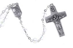 • Rosario Papa Francesco in vetro trasparente con Stemma papale e disegno originale della Croce Pettorale del “Buon Pastore” (sconti per quantità)