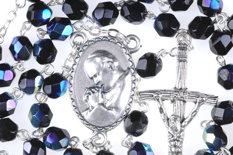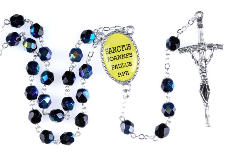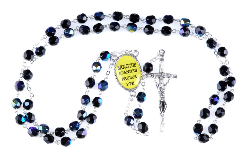 Black scarab fire polished glass Rosary with Saint John Paul II effigy, 6mm beads.