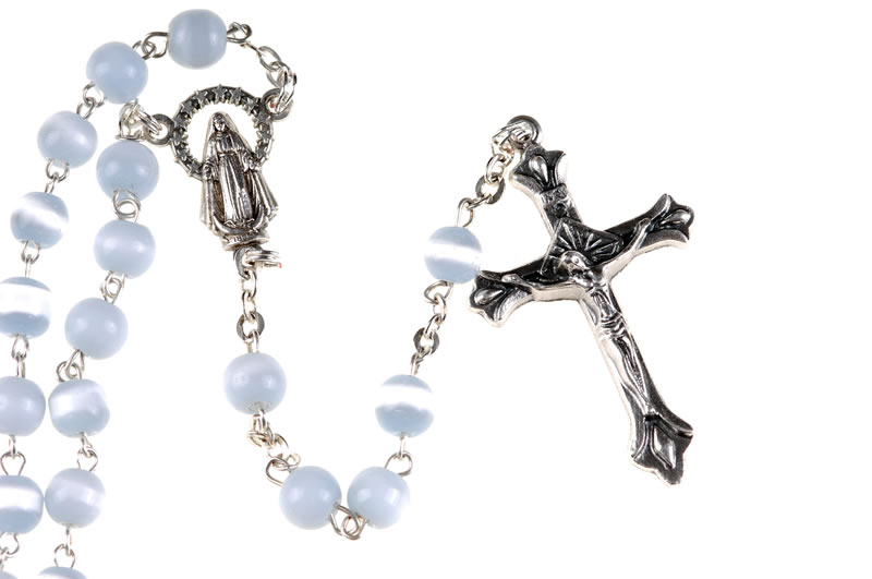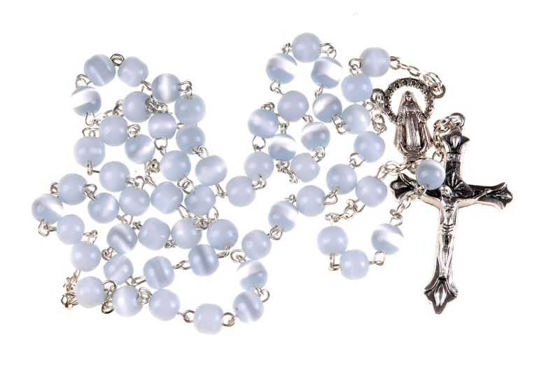 Rosario celeste, grani da 6mm in vetro con lavorazione ad occhi di gatto così chiamato per i particolari riflessi