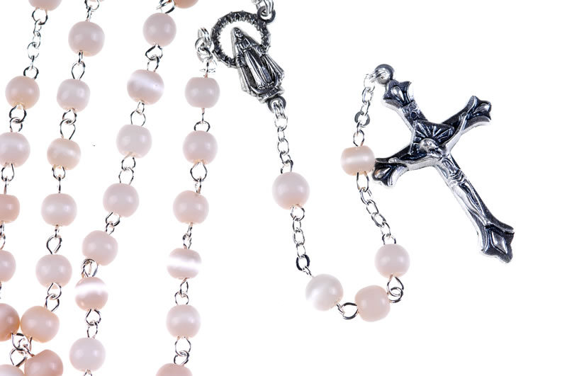 Rosario rosa, grani da 6mm in vetro con lavorazione ad occhi di gatto così chiamato per i particolari riflessi