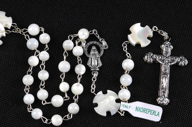 Rosario in madreperla grani da 6mm, in questo rosario, al posto delle perle che si usano comunemente, per separare le decine ci sono delle splendide croci anchesse in madreperla. A garanzia del materiale in vera madreperla, ogni rosario è provvisto di una etichetta “made in italy vera madreperla”. Questo rosario si può indossare al collo.