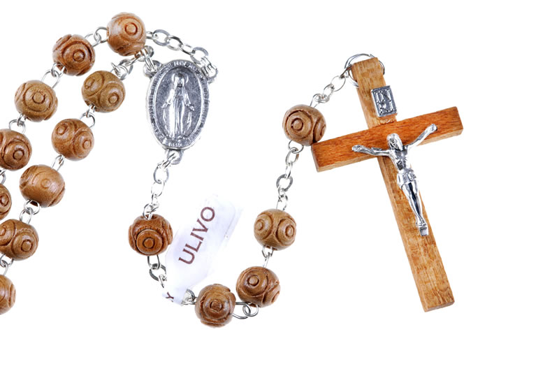 Rosario in legno di vero ulivo, grani lavorati 8mm con etichetta di garanzia “vero ulivo” e crocera in alluminio della Madonna Misericordiosa
