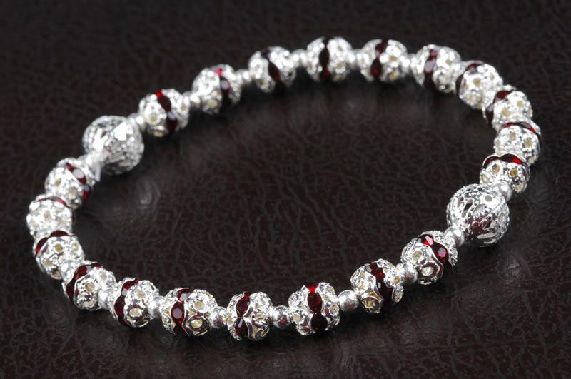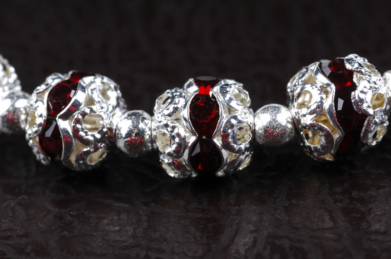Rosary elastic bracelet of Bohemian crystal rhinestone, dark red and silver metal, beads of 6mm