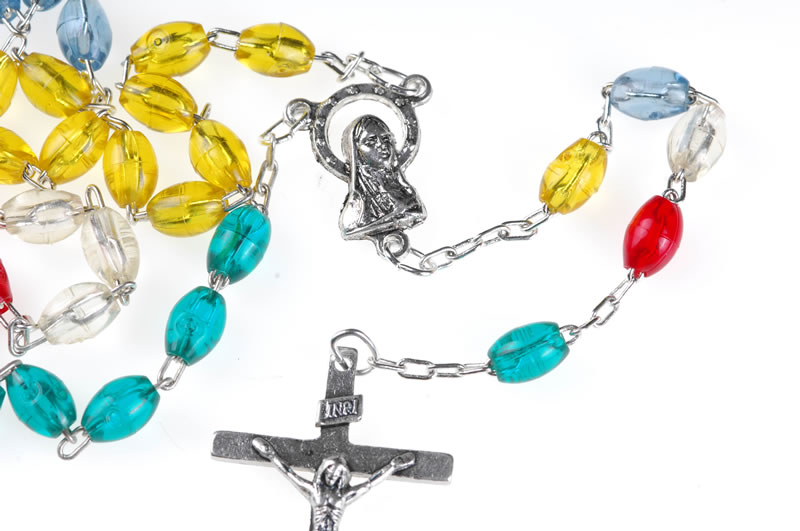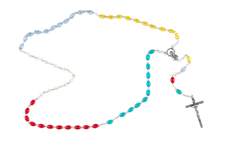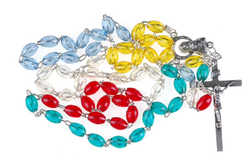 Rosario Missionario in plastica trasparente con grani ovali 6x8mm montati su catena a macchina. Il rosario si chiama così perchè si prega per i cinque continenti e si usa una corona nella quale i colori delle decine richiamano i continenti.