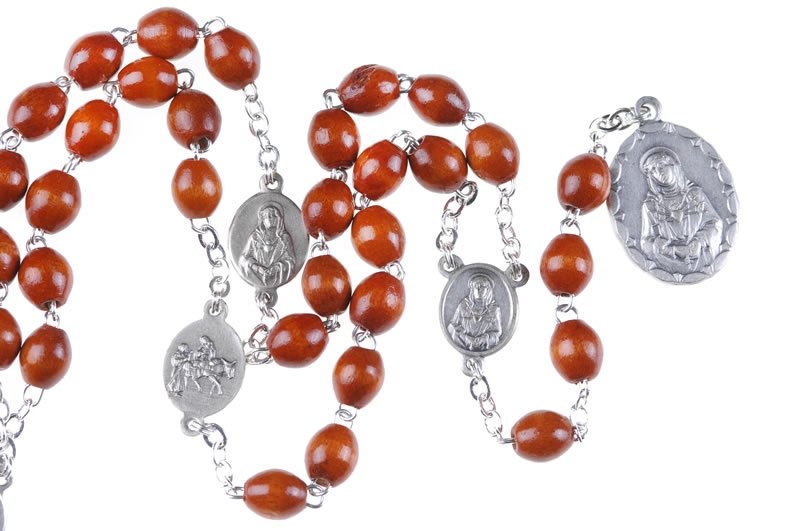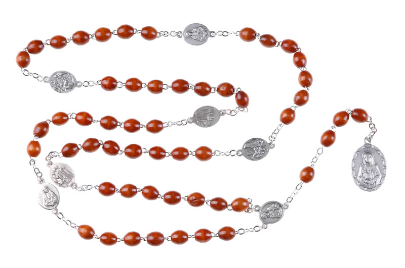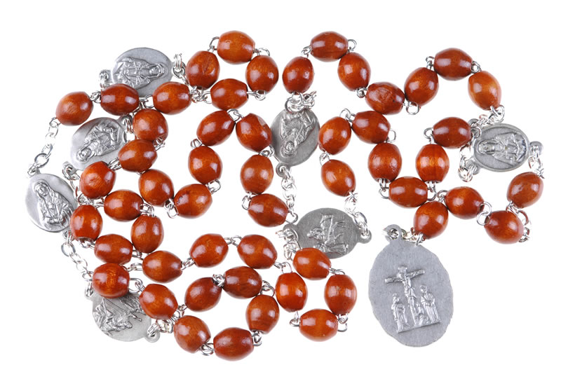 Rosario Nuestra Señora de la Via Crucis , en madera natural y estaciones de metal , cuentas de 6x8mm