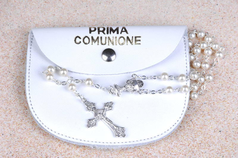 Astuccio portarosario da Prima Comunione in vera pelle bianca, chiusura a bottoncino