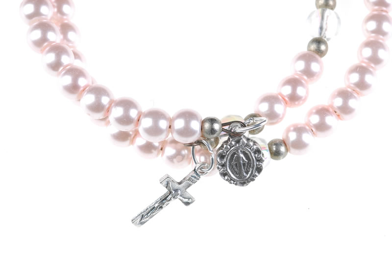 Bracciale Rosario in vetro cerato con grani da 6mm imitazione perla con croce, e medaglia della Madonna misericordiosa.