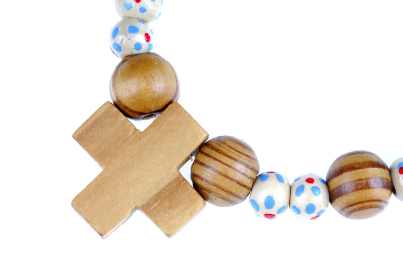 Bracciale Rosario elastico in legno naturale con croce. Ogni braccialetto è confezionato in un pratico astuccio trasparente con apertura adesiva apri/chiudi.