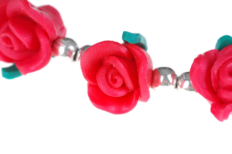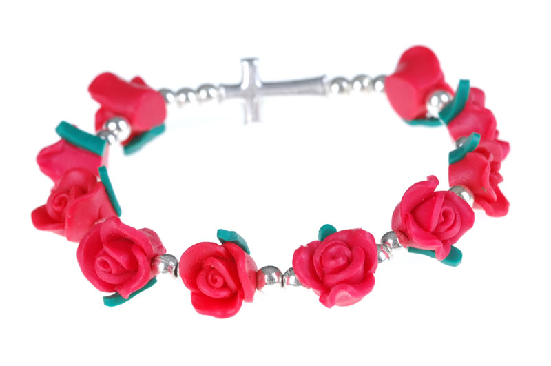 Bracciale Rosario con rose rosse, grani e croce in metallo. Ogni braccialetto è confezionato in un pratico astuccio trasparente con apertura adesiva apri/chiudi.