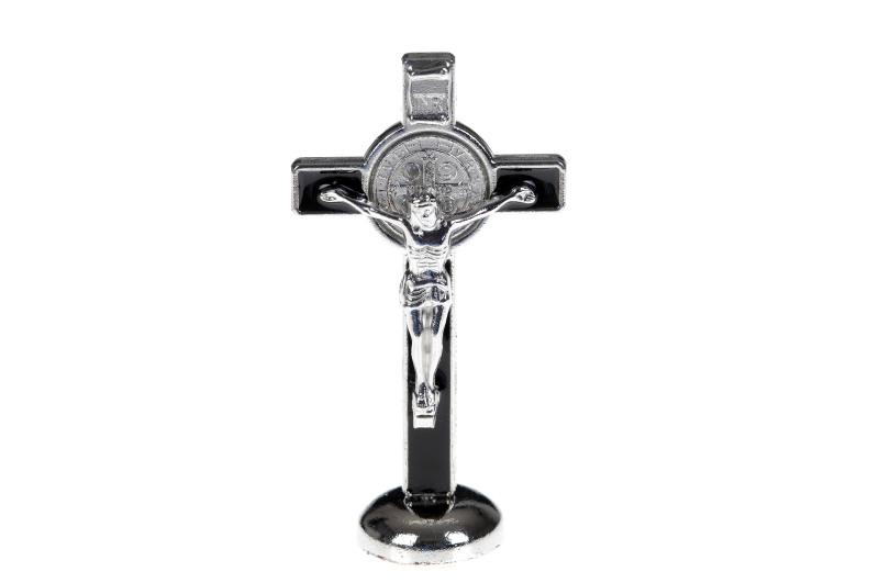 Crocifisso da tavolo in metallo laccato nero con base adesiva e medaglia di San Benedetto, mm 80×40