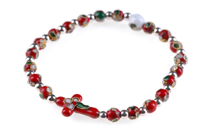 Rosario bracciale elastico in cloisonnè rosso con croce e grani 6mm. Il cloisonnè o altrimenti chiamato lustro di Bisanzio , è una tecnica di decorazione artistica a smalto, nella quale dei sottili fili (filigrane) o listelli metallici, alveoli, celle o (detti in francese cloisons) vengono saldati o incollati al supporto supporto dell’opera da costruire; successivamente quindi, nelle zone rilevate dal metallo, viene colato dello smalto, ottenendo quindi una sorta di mosaico le cui tessere sono circoscritte esattamente dai listelli metallici.