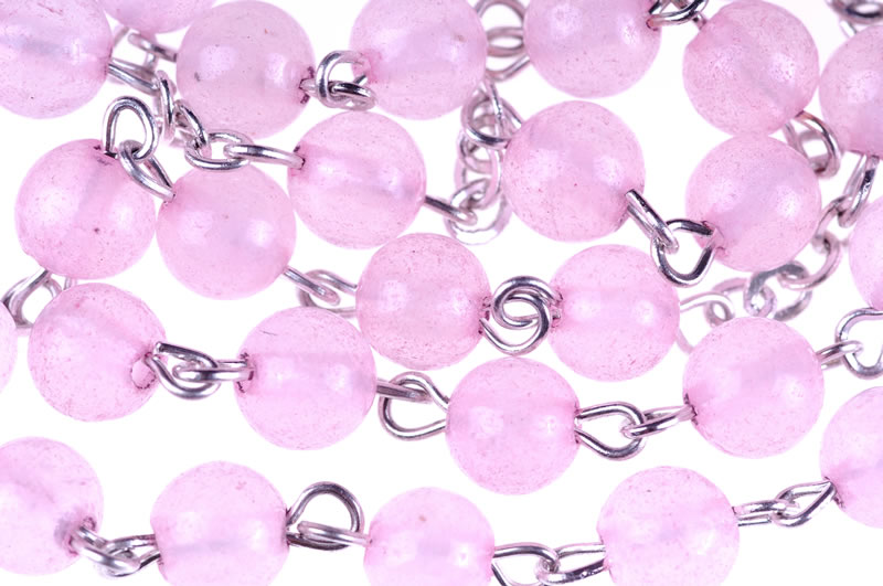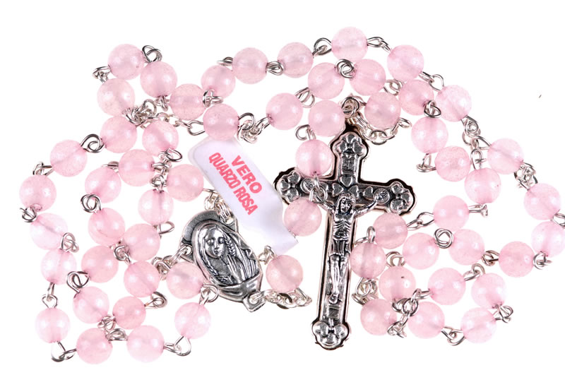 Rosario in quarzo rosa, grani 6mm. A garanzia del prodotto, ogni rosario è provvisto di etichetta che ne attesta la veridicità del materiale. Questo rosario si può indossare al collo. Ogni Rosario è confezionato in un pratico astuccio trasparente con apertura adesiva apri/chiudi.