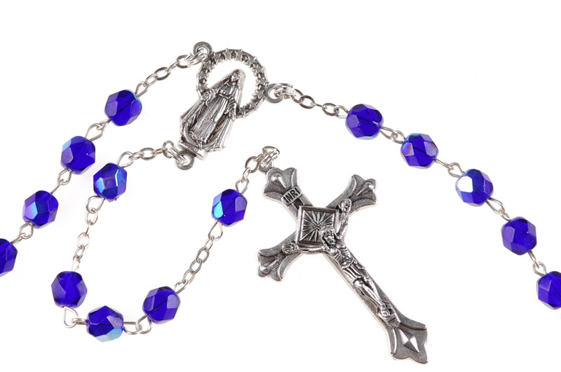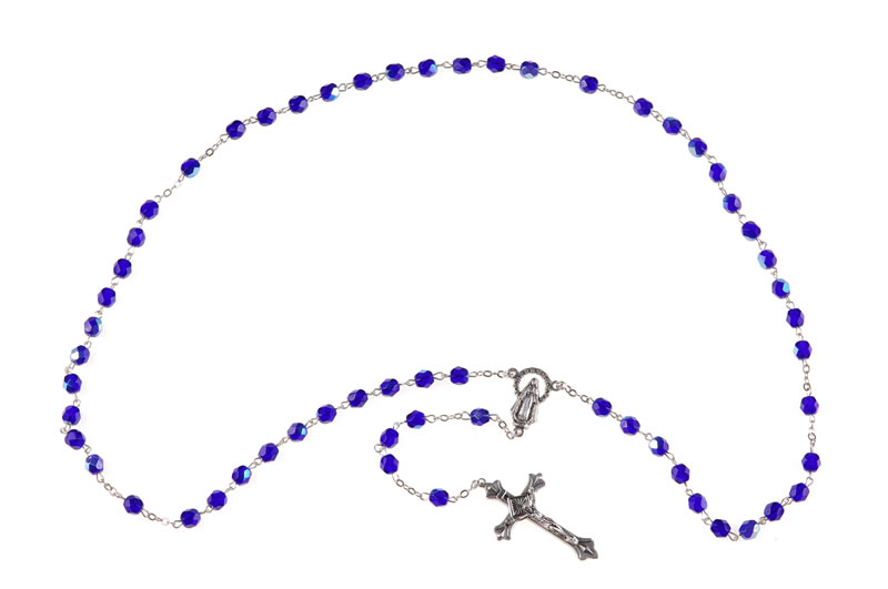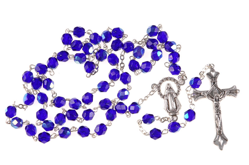 Rosario in semicristallo blu con grani da 6mm. Questo rosario si può indossare al collo. Ogni Rosario è confezionato in un pratico astuccio trasparente con apertura adesiva apri/chiudi.