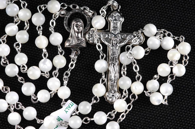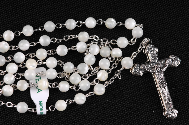 Rosario in vera madreperla, grani da 4mm. A garanzia del prodotto, ogni rosario è provvisto di etichetta “made in italy vera madreperla”. Ogni Rosario è confezionato in un pratico astuccio trasparente con apertura adesiva apri/chiudi.