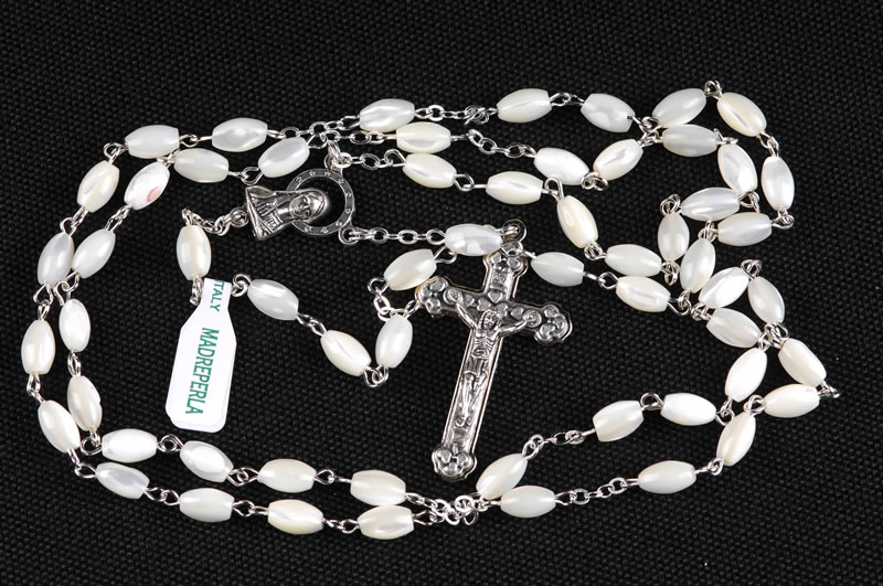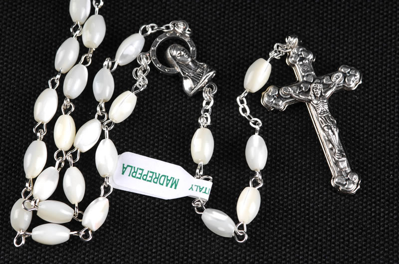 Rosario in vera madreperla, grani da 5x8mm. A garanzia del prodotto, ogni rosario è provvisto di etichetta “made in italy vera madreperla”. Ogni Rosario è confezionato in un pratico astuccio trasparente con apertura adesiva apri/chiudi.