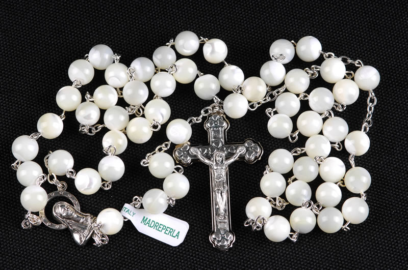 Rosario in vera madreperla, grani da 8mm. A garanzia del prodotto, ogni rosario è provvisto di etichetta “made in italy vera madreperla”. Questo rosario si può indossare al collo. Ogni Rosario è confezionato in un pratico astuccio trasparente con apertura adesiva apri/chiudi.