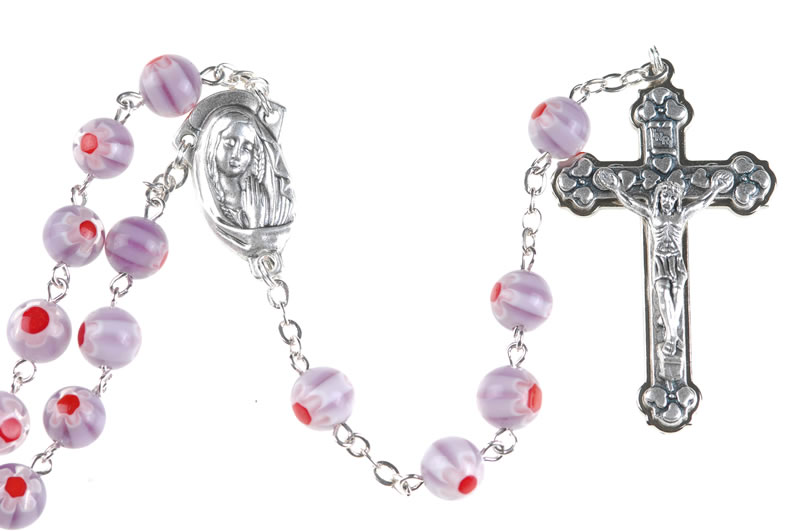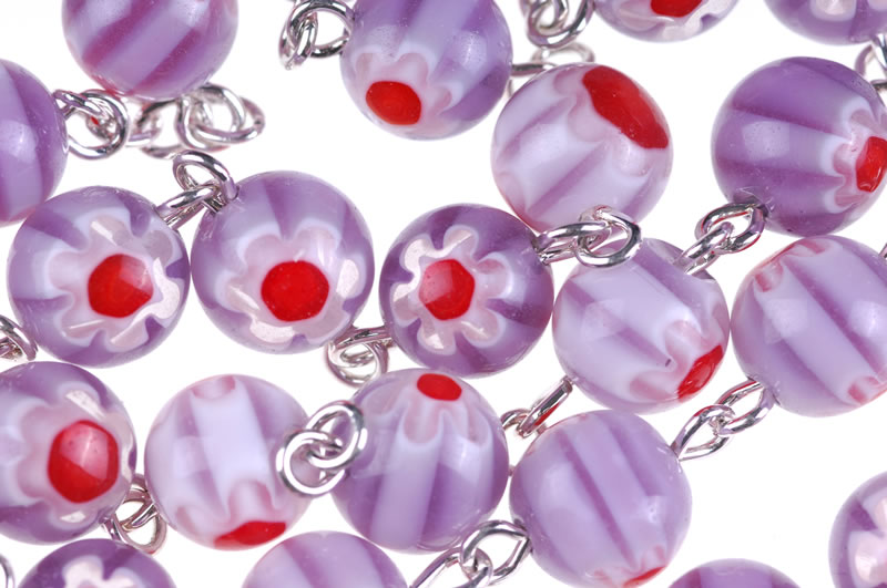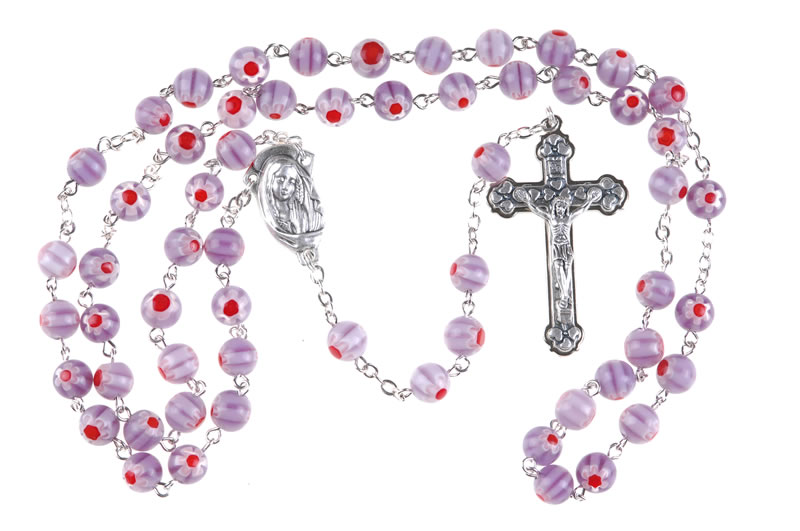 Rosario in vetro viola stile murrina, grani 8mm. Ogni Rosario è confezionato in un pratico astuccio trasparente con apertura adesiva apri/chiudi.