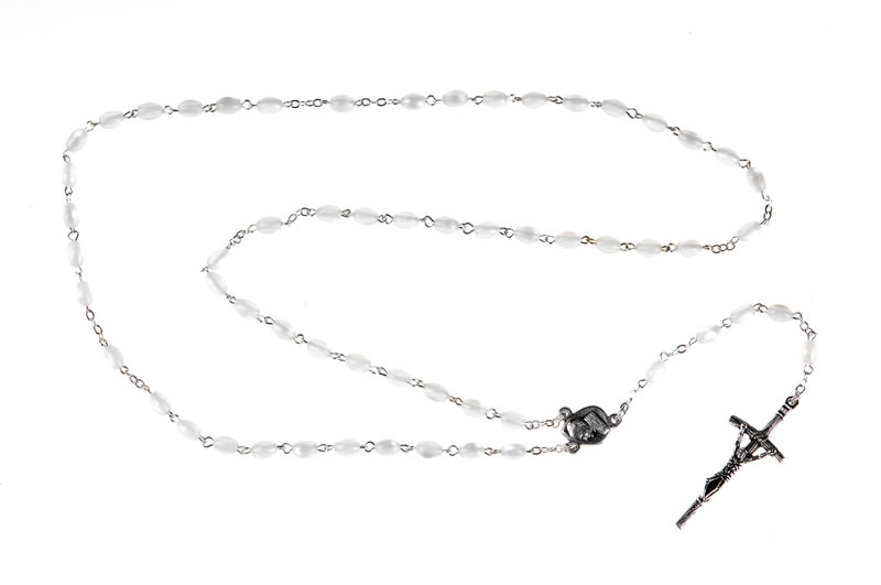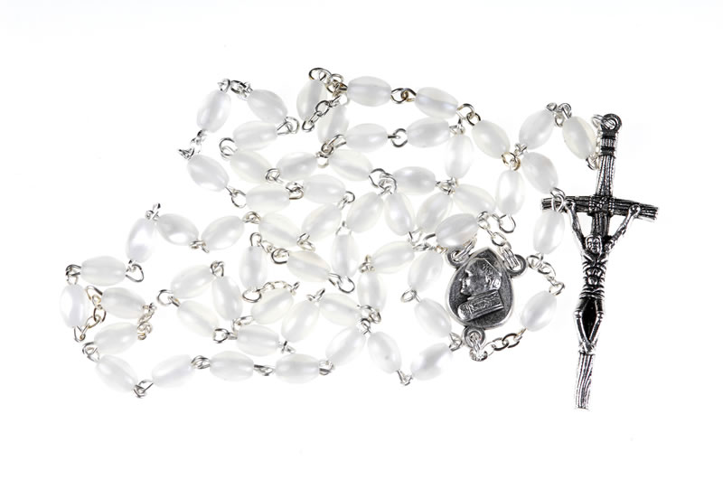 Rosario papa Giovanni Paolo II, in vetro imitazione madreperla grani 5x7mm, sulla crocera l’ effige in rilievo di Papa Giovanni Paolo II e croce pastorale. Ogni Rosario è confezionato in un pratico astuccio trasparente con apertura adesiva apri/chiudi.
