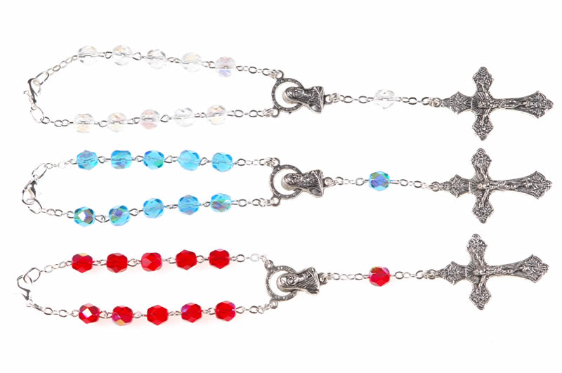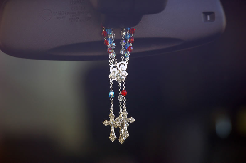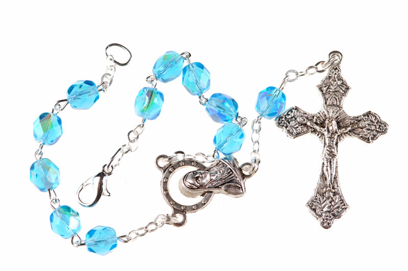 Rosario per auto in semicristallo celeste, grani 5mm, la corona è provvista di un gancio di apertura, studiato appositamente per essere applicato allo specchietto retrovisore dell’ auto, o in qualunque punto sia necessario aprire la corona del rosario