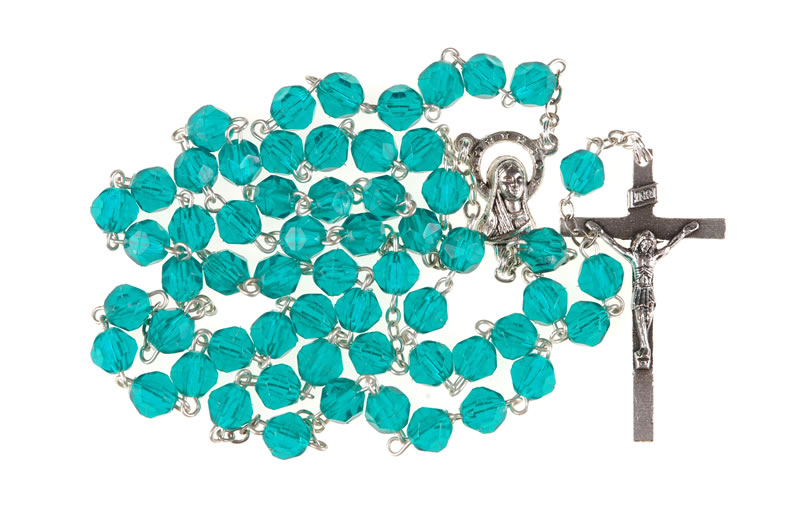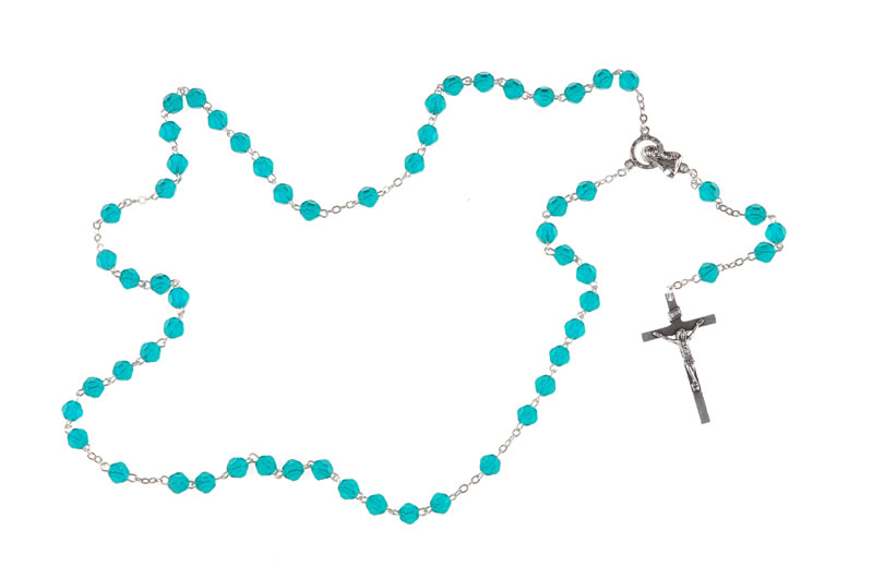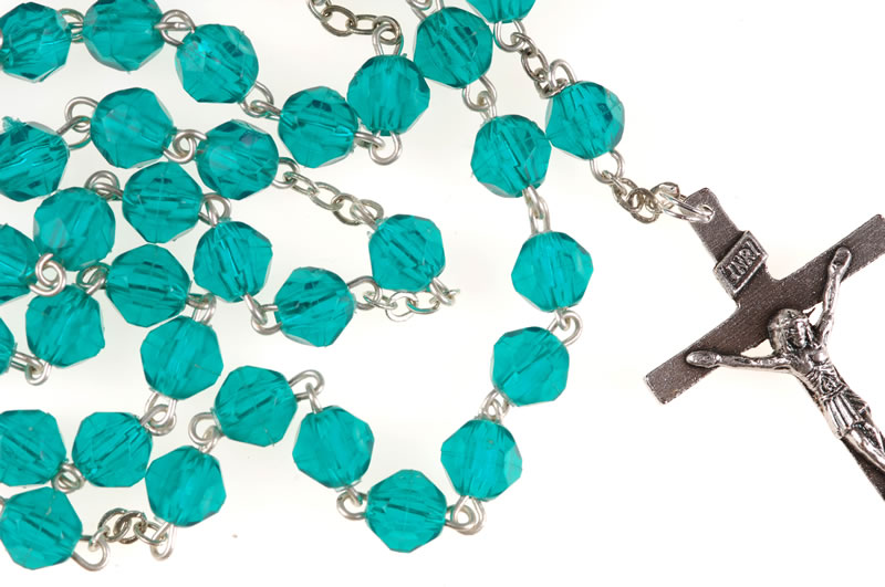 Rosario verde in plastica trasparente con grani sfaccettati imitazione cristallo da 6mm montati su catena a macchina. Ogni Rosario è confezionato in un pratico astuccio trasparente con apertura adesiva apri/chiudi.