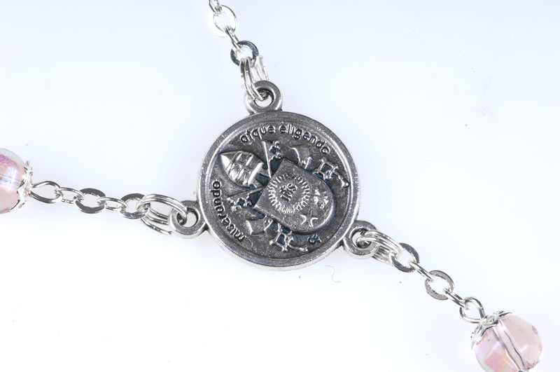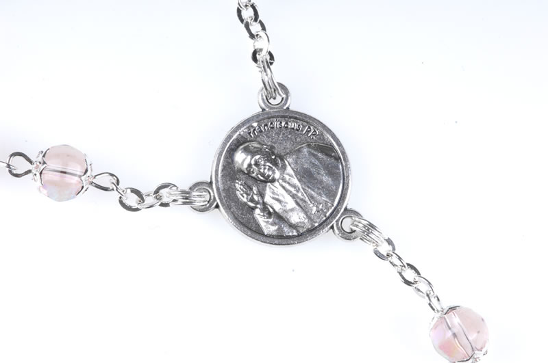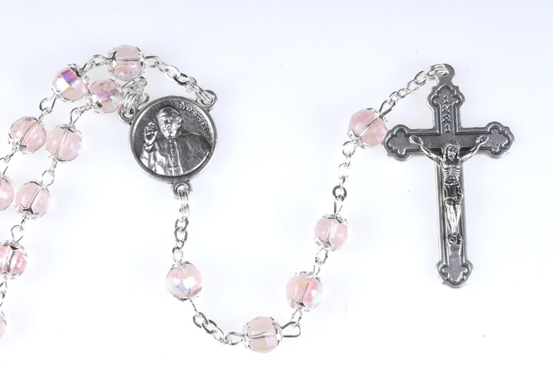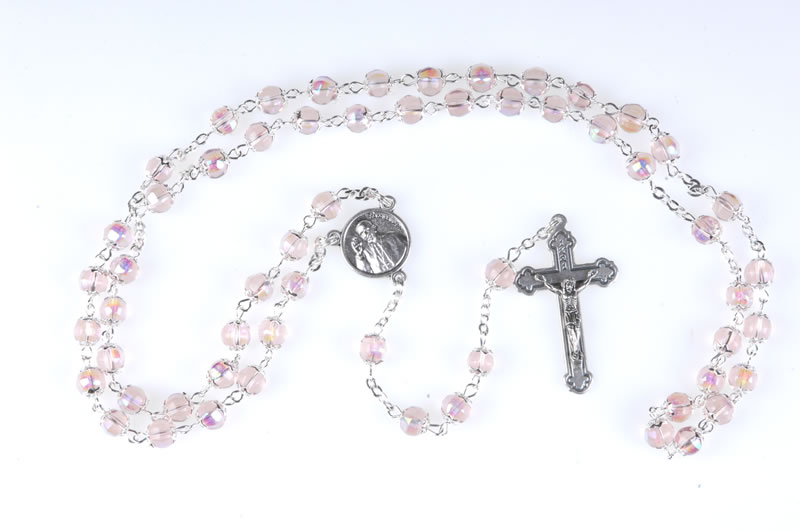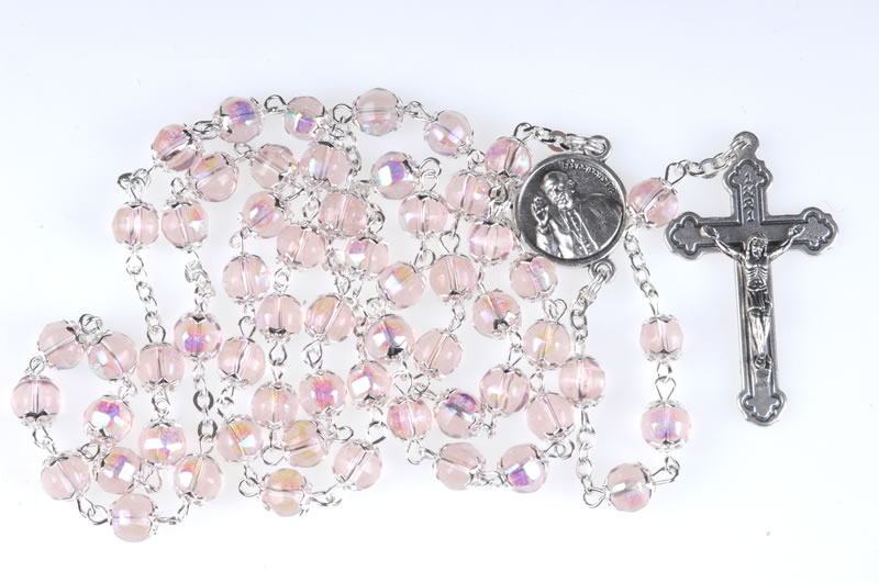 Rosario papa Francesco in vetro rosa imitazione cristallo, sul diritto della crocera in metallo l’ effige di Papa Francesco, sul retro lo stemma del pontefice, grani coppigliati 7mm, il rosario può essere portato al collo. Ogni Rosario è confezionato in un pratico astuccio trasparente con apertura adesiva apri/chiudi.