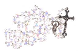 • Rosario color cristallo con grani a forma di cuore, crocera della Madonna miracolosa (sconti automatici per quantità)